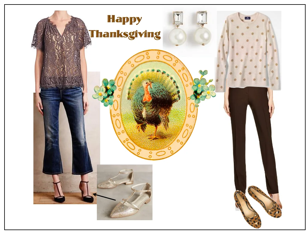 Tones of blue, brown, bronze, chestnut, gold and grey mix well and add a bit of sophistication to any style. Don't forget to finish each look with simple jewelry. For links to all of the above and many more Thanksgiving Day ideas, click here.