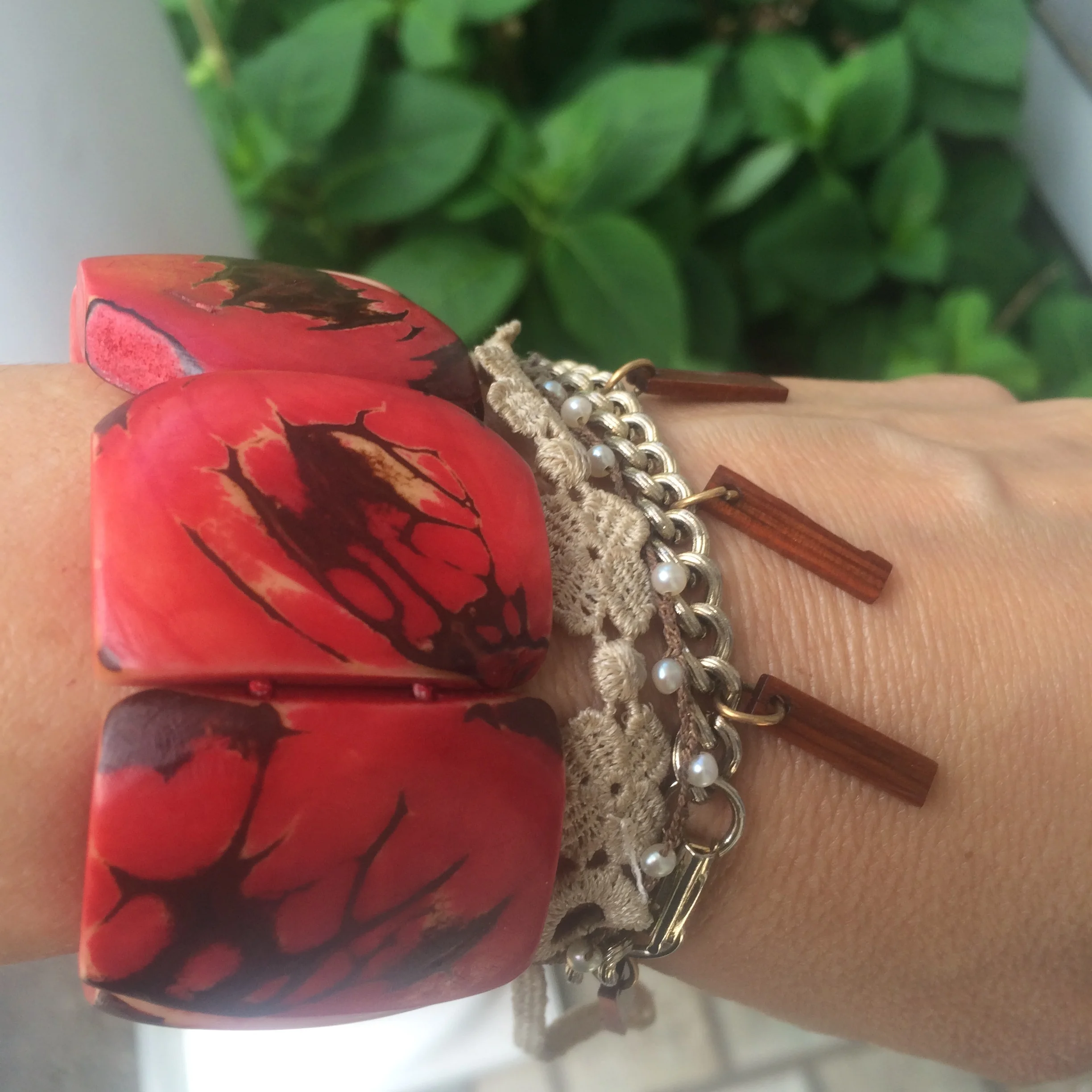 Each of the bracelets above repeats its shape over and over. The large red rectangles repeat as do the crocheted flowers, the pearls, the links and the brown rectangles. The contrast comes into play with the softness and texture of the crocheted yarn and twisted silk rope (with pearls attached) against the smooth, hard red and brown rectangles. There is even more contrast in terms of size: the extra large red rectangles against the tiny pearls or smaller brown rectangles. But then the repetition comes back into play: the brown rectangles pick up the brown in the red bracelet. And then there's more contrast: the dark red and brown colors play against the creme and gold. But then the creme and gold colors are repeated in three consecutive lines.