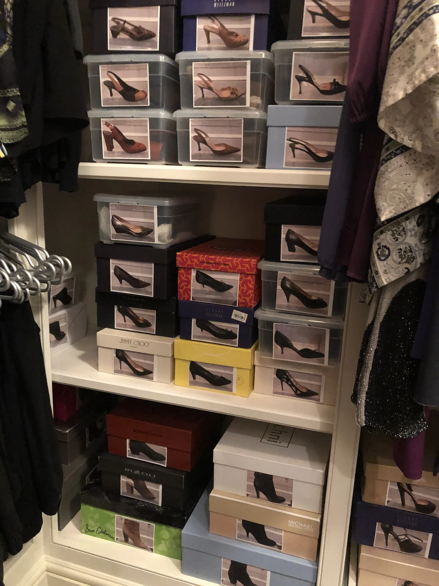 Keep shoes protected in boxes with images attached for easy organization.